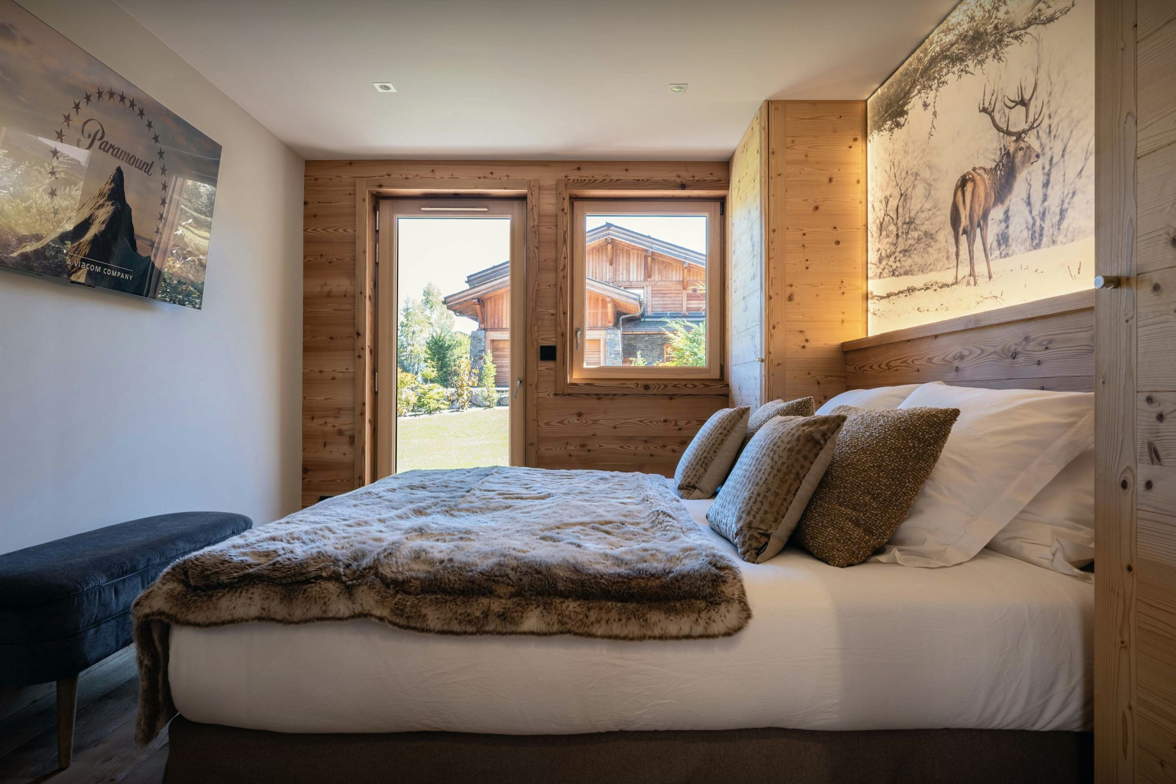 Vier der fünf Schlafzimmer, die sich über die drei Ebenen verteilen, verfügen über ein angrenzendes Badezimmer. Die drei im mittleren Stockwerk gelegenen Schlafzimmer bieten zudem Zugang zu einer Holzterrasse. Das letzte, ein charmanter Schlafsaal für sechs Personen auf der Gartenebene – bestehend aus einem Doppelbett und zwei Etagenbetten – ist durch einen Flur mit einem Duschraum und einer separaten Toilette verbunden. Für Ihren Komfort verfügt jede Etage des Chalets auch über Toiletten.