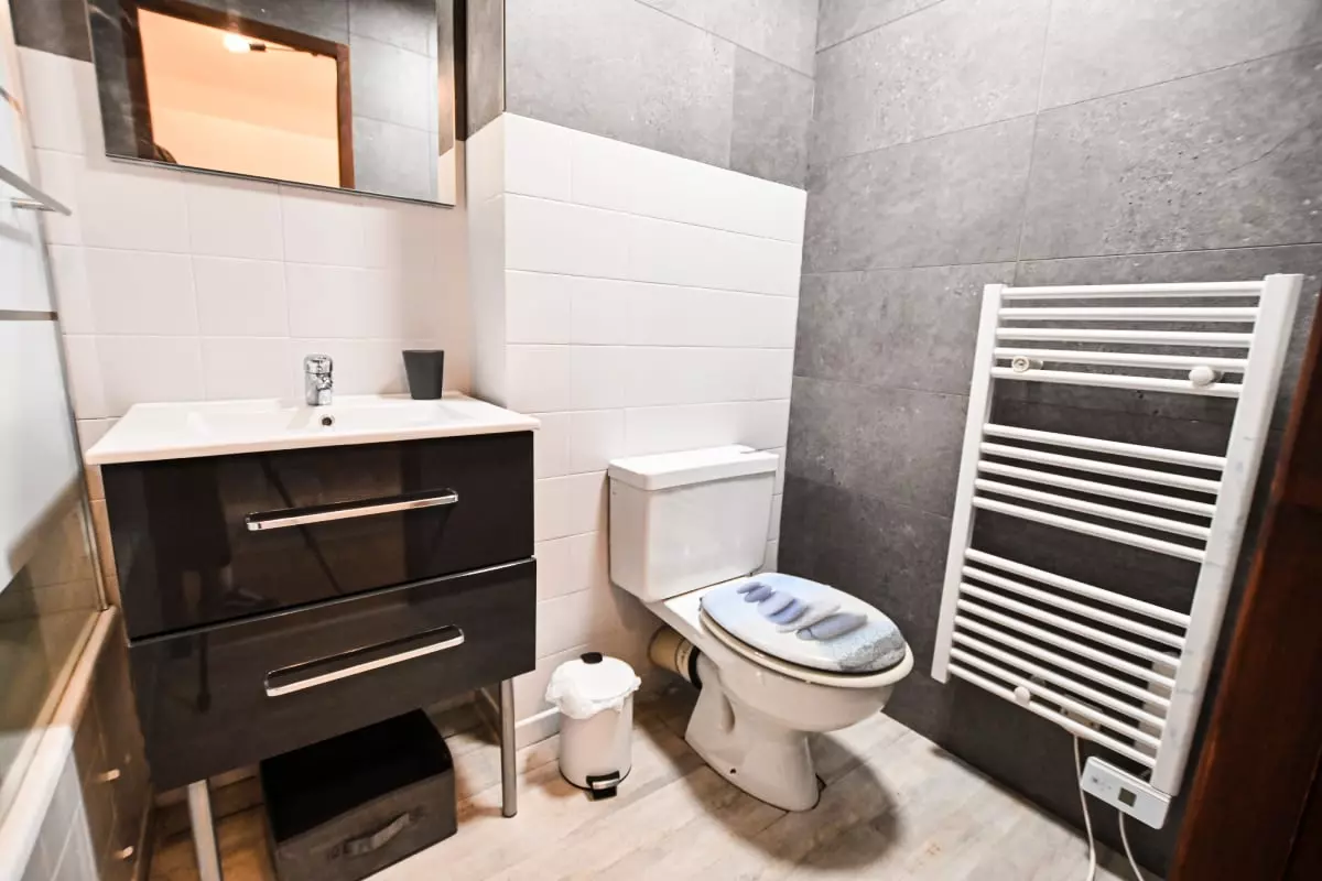 Badezimmer: Badewanne, Waschbecken, Toilette und Handtuchtrockner. Wiederaufladbarer Haartrockner.