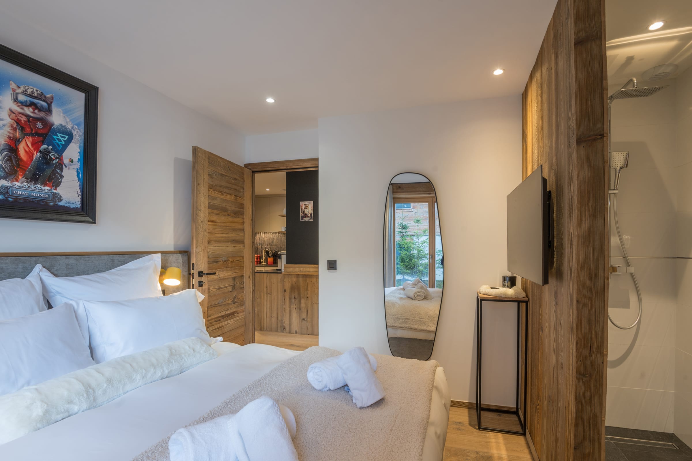 - ein Elternschlafzimmer mit einem 160 cm breiten Kingsize-Bett und einem angrenzenden Badezimmer (Dusche),